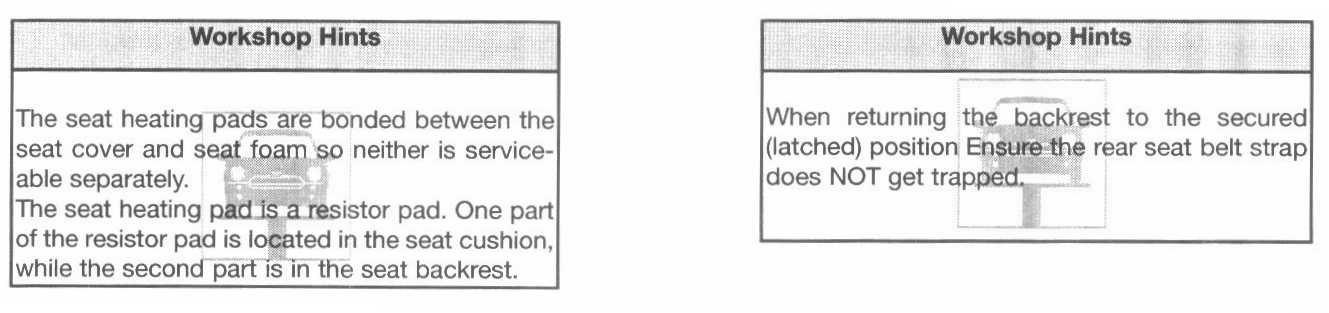 The rear seat configuration on all MINI COOPER derivatives is of a one piece seat cushion and 50/50 split, folding backrests. Removal of the cushion is achieved by lifting the front edge of the seat cushion and then pressing down on the rear edge to release from the rear edge body clips.