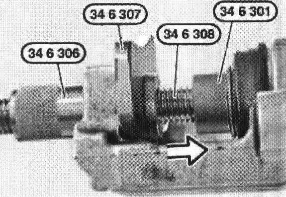 Using special tools 34 6 301 /34 6 306 /34 6 307 / 34 6 308 as shown, press brake piston into caliper.