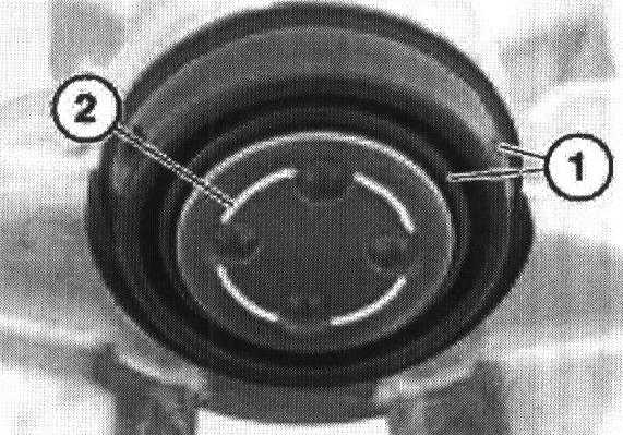 Clean contact surfaces (1 - 2) of brake-lining tee heads/brake caliper housing and coat with anti-squeak compound.