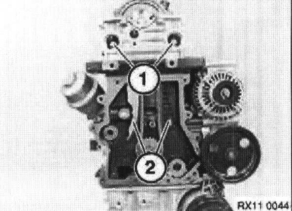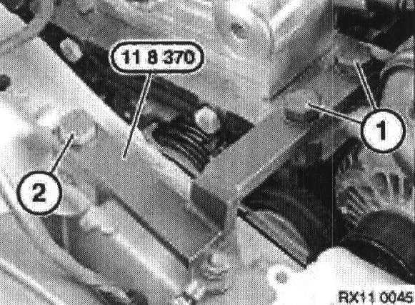Fit special tool 11 8 370 on cylinder block (1) and engine mounting (2).