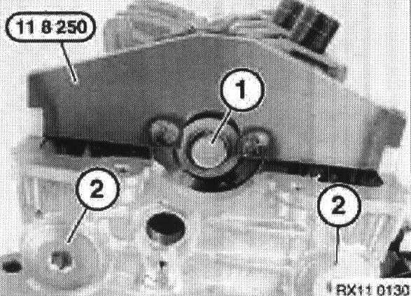 Release camshaft retaining bolt (1) and hold camshaft gear with special tool 11 8 250.