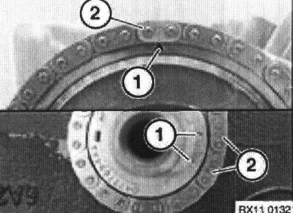 The two triangular adjustment marks (1) on crankshaft gear must be aligned with copper-colored timing chain links (2).