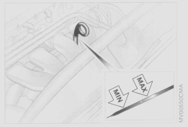 the oil volume between the two marks on the dipstick ("MIN","MAX") corresponds to approx. 1.1 US quarts (1 liter). Do not fill beyond the upper notch on the dipstick. Excess oil will damage the engine.