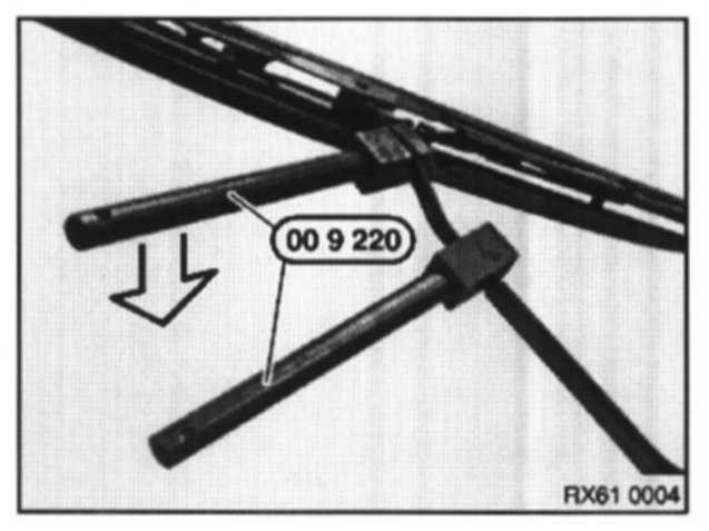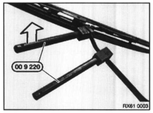If the approach angle is too large (light gap at top between gauge and wiper blade), grip wiper arm special tool 00 9 220 and turn with special tool 00 9 220 in direction of arrow.