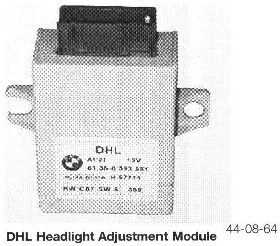Dynamic Headlight Adjustment (DHL - Xenon Only)Cars equipped with Xenon headlights require automatic headlight aim control; this necessitates a separate control module to carry out automatic adjustment of the headlights. With automatic headlight leveling, the load status and its changes are recorded by means of two height level sensors (potentiometers) located at the front and rear axles. The information from these sensors is communicated back to the DHL module.