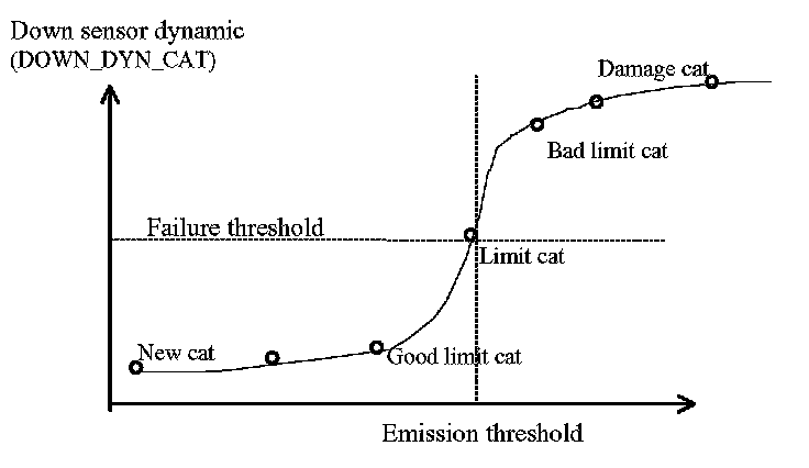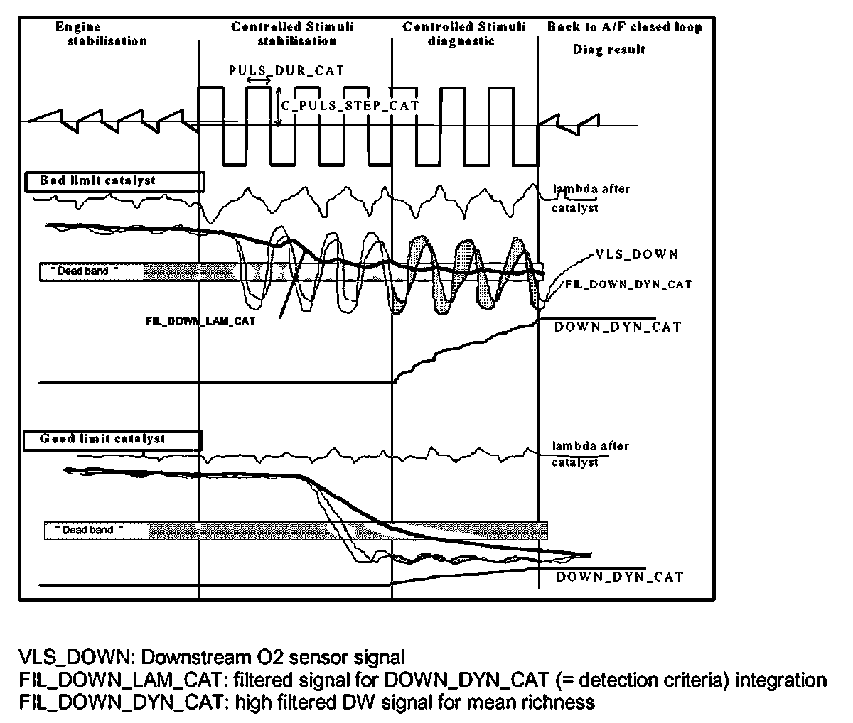 During the 'Controlled stimuli - diagnosis phase' the downstream sensor activity is measured and corresponds to the OSC of the catalyst. If this activity is high (low OSC) the diagnosis criteria DOWN_DYN_CAT is high.