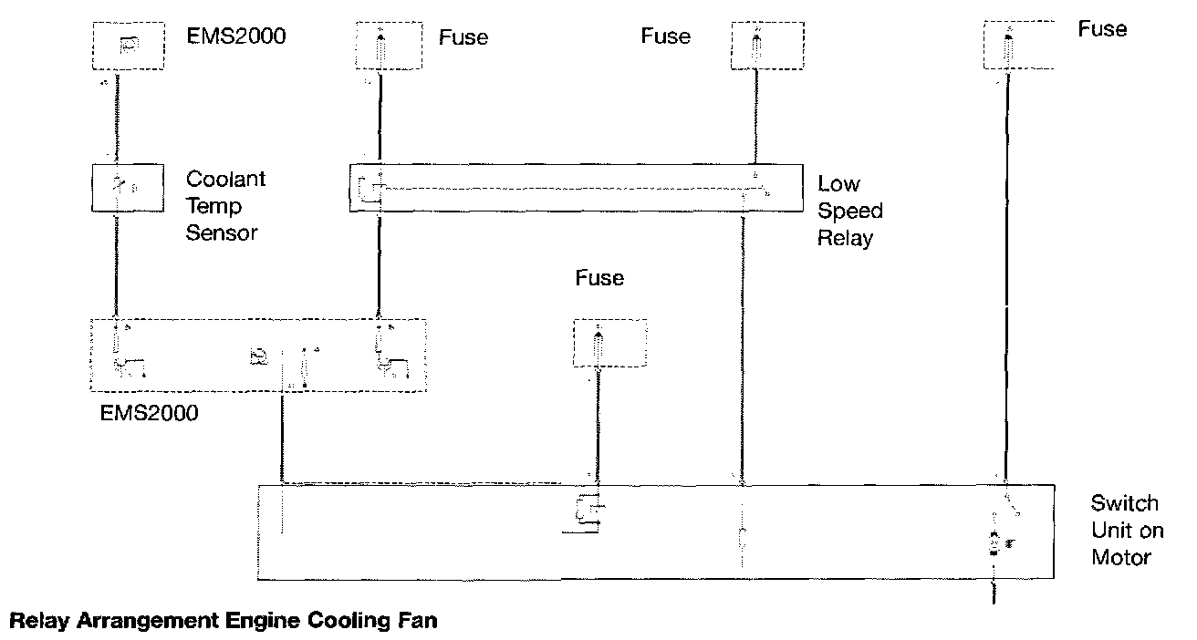 The Engine Coolant Fan is controlled by the EMS2000 through a relay and relay pack at two different speeds, Low and High.