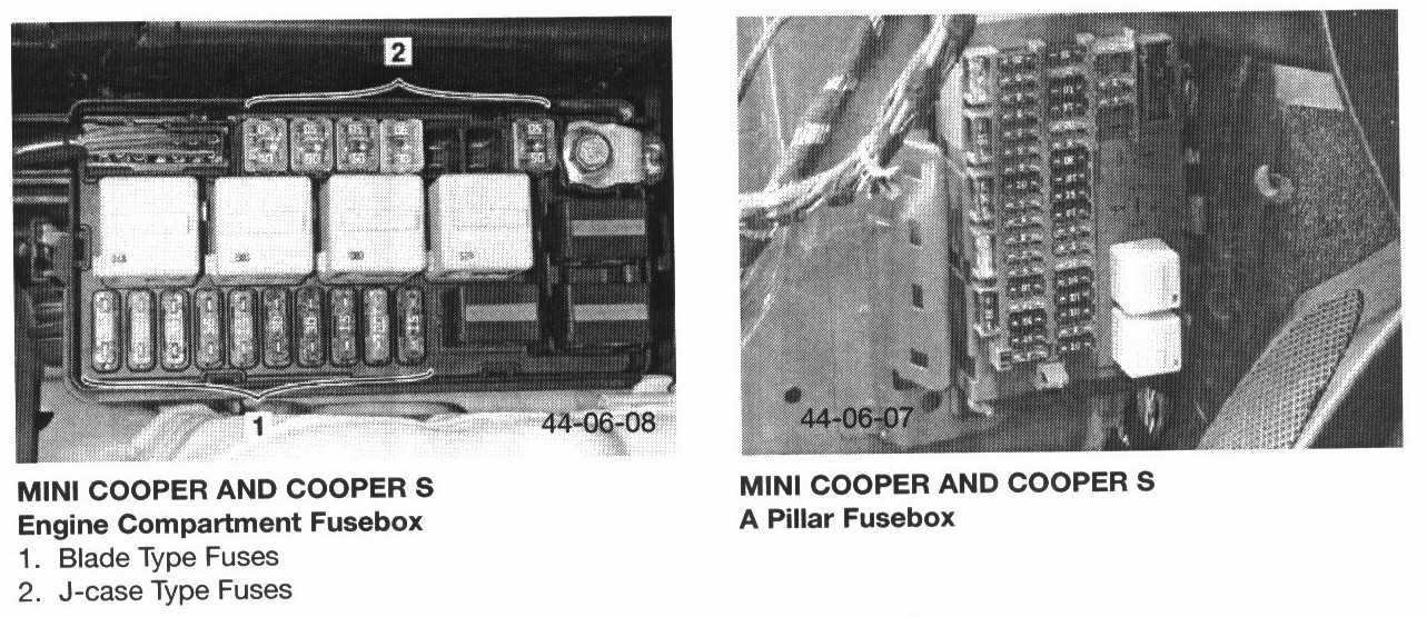 There are two fuse boxes on the MINI COOPER. One is located in the engine compartment (adjacent to the battery) and the other one is located at the base of the left side a pillar.