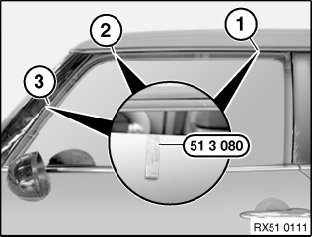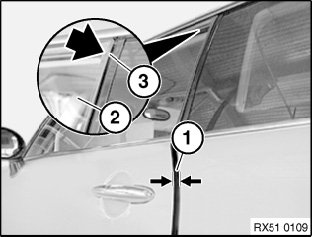 In this position the top edge of door window (2) must touch door seal (3) when it is subjected to load with light finger pressure.