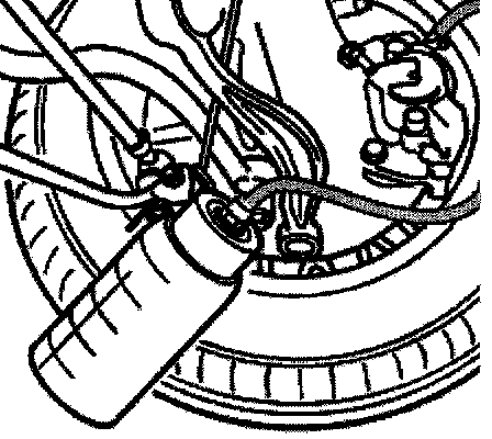 Connect bleeder hose and bottle to bleed valve on rear right brake caliper.