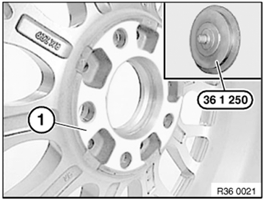 Use matching adapter from special tool kit 36 1 300 (wheel bolt adapter set) to release and tighten down lockable wheel bolt.