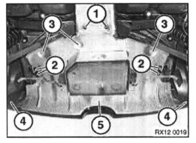 Remove nut (1), screw (2) and scrivets (3) securing underbody panel.