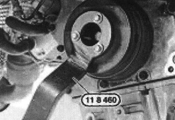 Fit special tool 11 8 460 to retain crankshaft pulley.