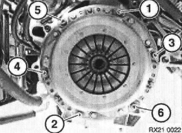Replace pressure plate retaining bolts and tighten retaining bolts gradually in sequence (1-6).