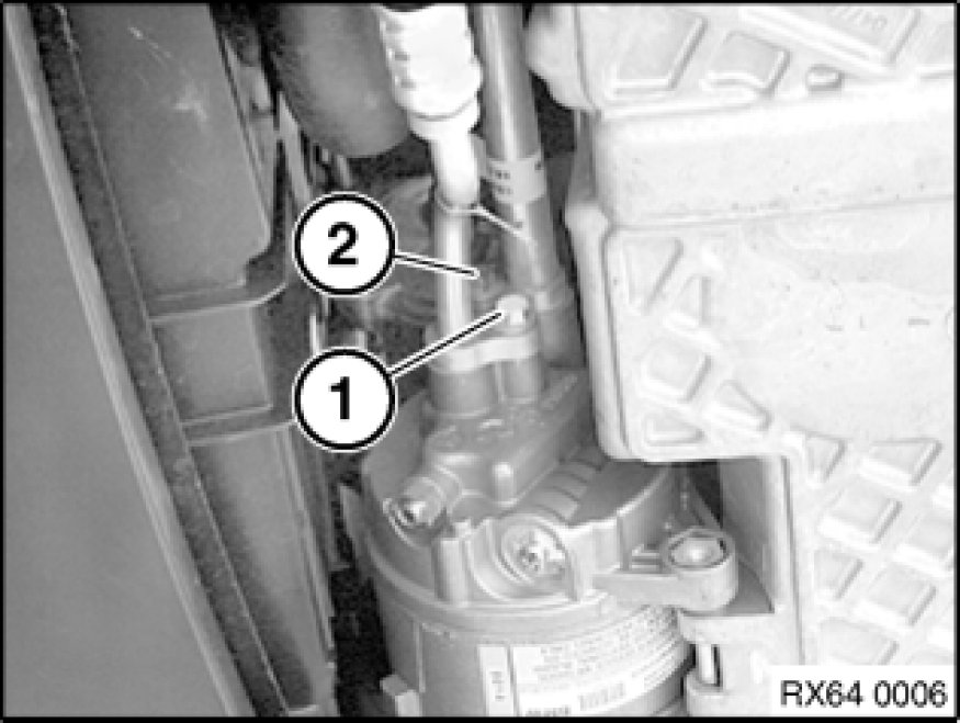 Release lower retaining bolt (1) on A/C compressor, tightening torque 64 52 1AZ [1][2]Compressor HVAC.