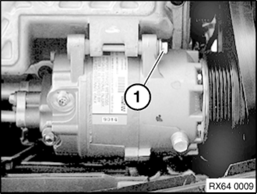 Release bolt (1) at top left on A/C compressor, tightening torque 64 52 1AZ [1][2]Compressor HVAC.