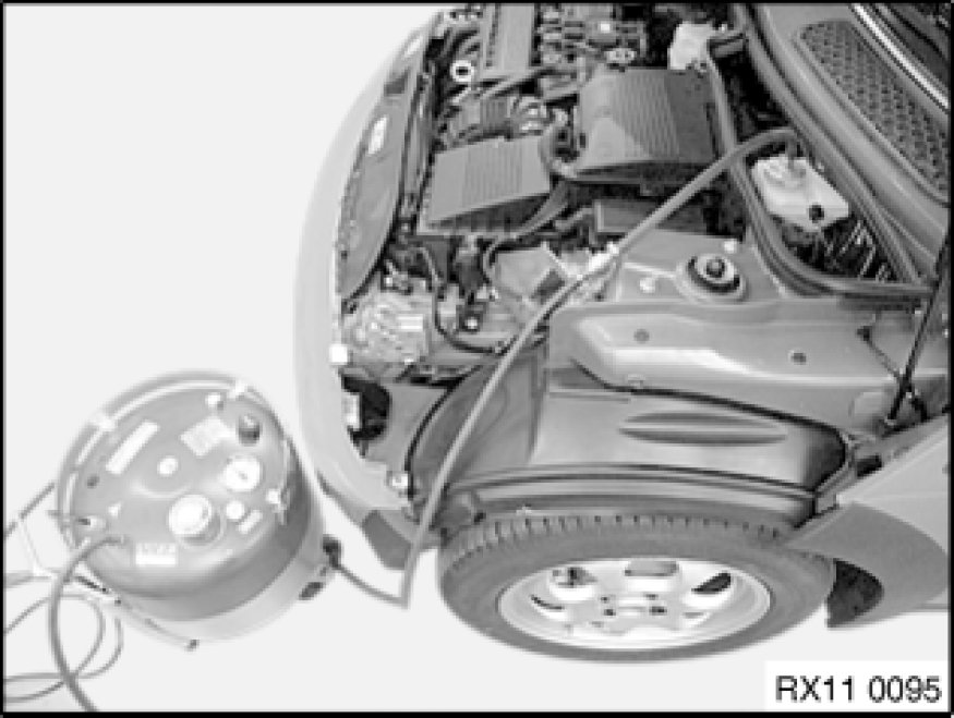 Connect bleeder hose and collecting container to bleeder valve at front right wheel brake.