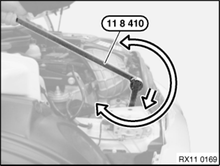 Attach special tool 11 8 410 11 8 410 Lever to tensioner (1).