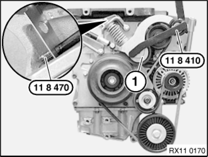 Relieve tension of drive belt and block tensioner with locking pin, special tool 11 8 470 11 8 470 Locking Pin.