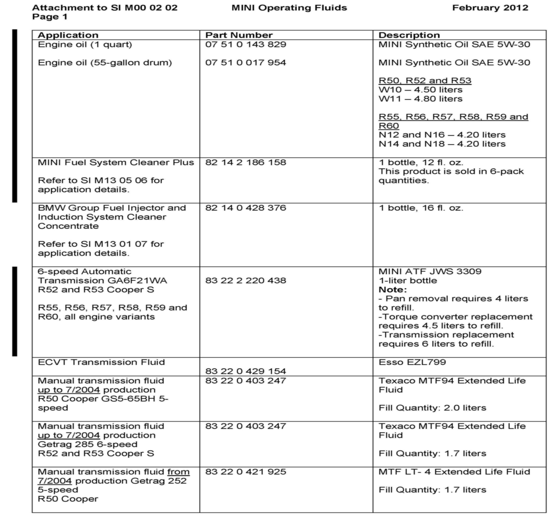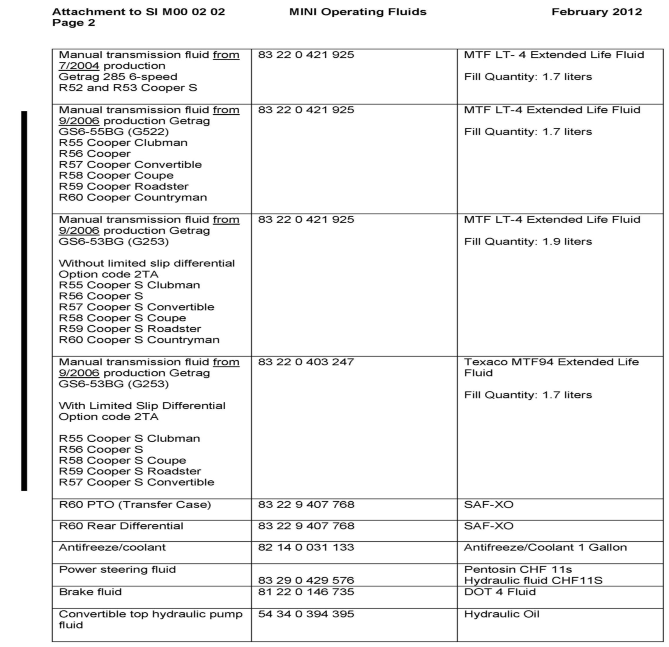 Fluids and sealers that are described in this Operating Fluids bulletin are MINI approved (see attachment). Using non-approved fluids or sealers can lead to premature failure and will not be covered under Warranty.