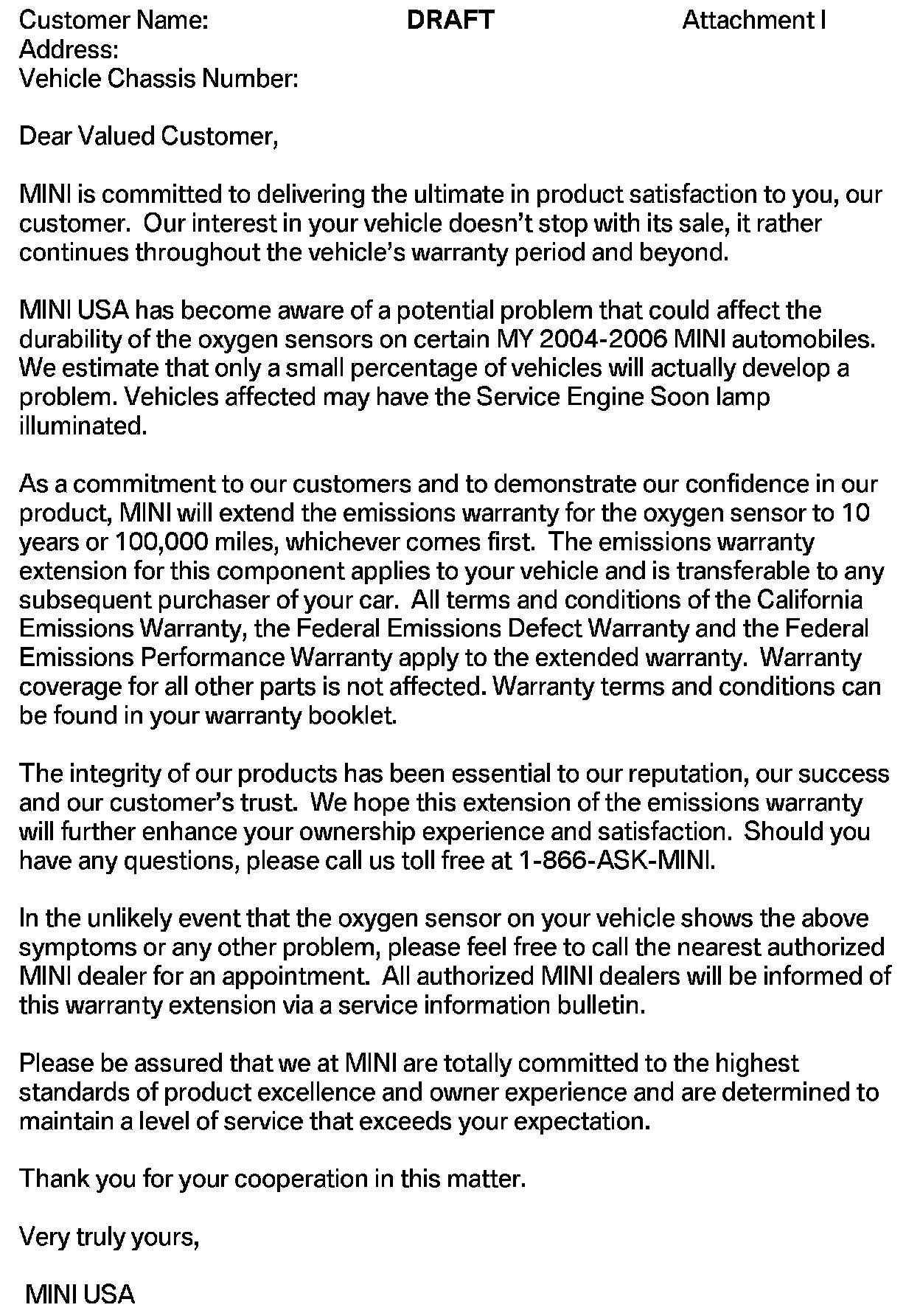 MINI has informed all affected owners of the above-listed models of their extended oxygen sensor emissions warranty. A sample letter is shown.