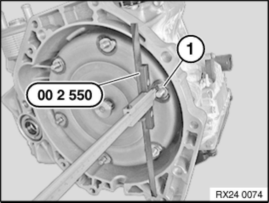 Determine distance between contact surface and surface (1) of tapped hole in torque converter with special tool 00 2 550 00 2 550 Depth Gauge.