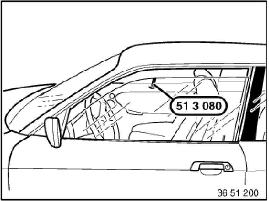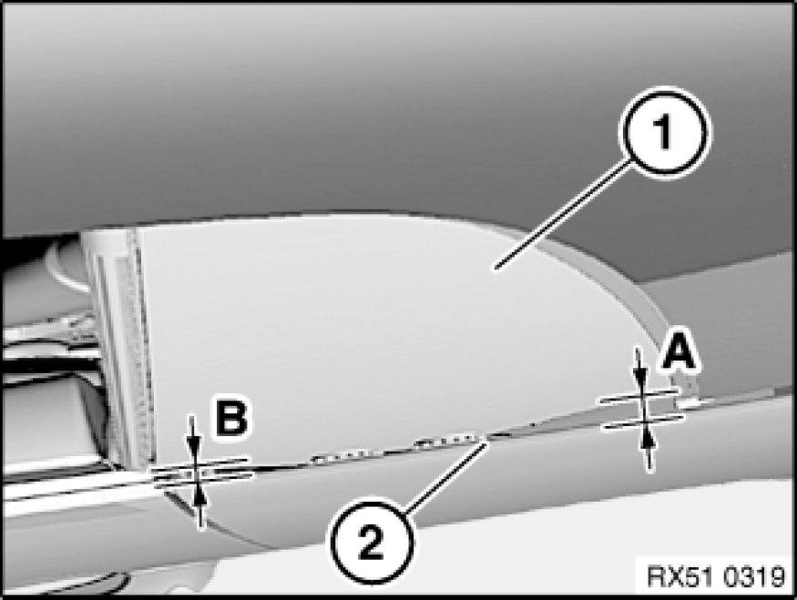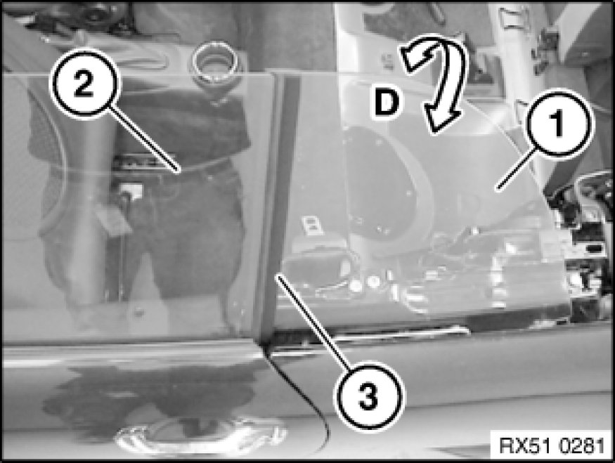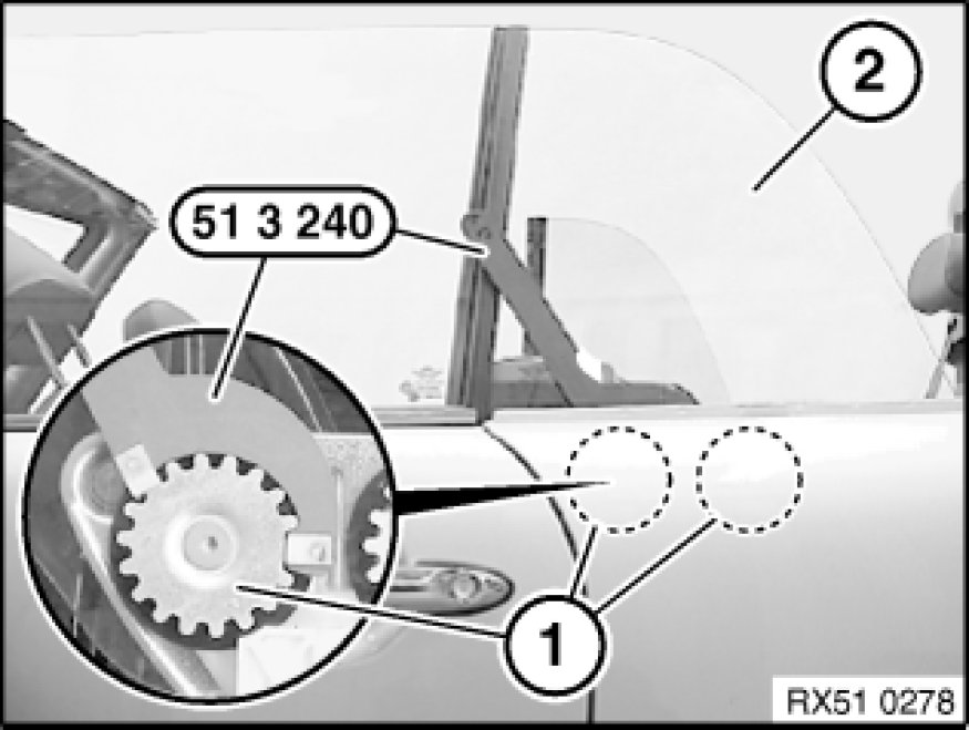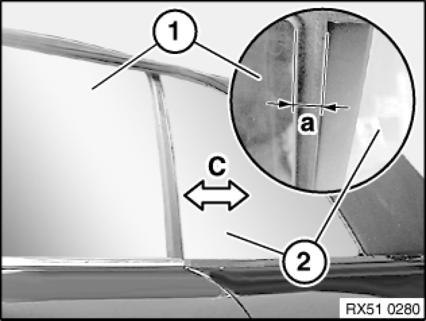 Slacken shims (1) of side window (2) with special tool 51 3 240 (do not release fully).