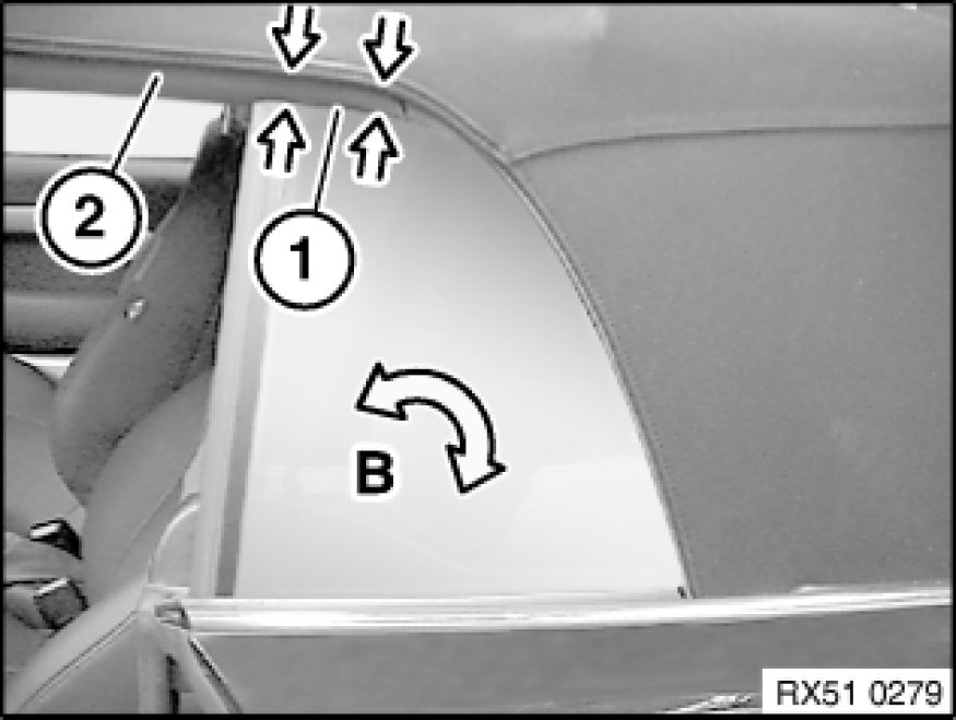 Door window glass (2) must rest firmly on side window seal (3) when Convertible top is open.