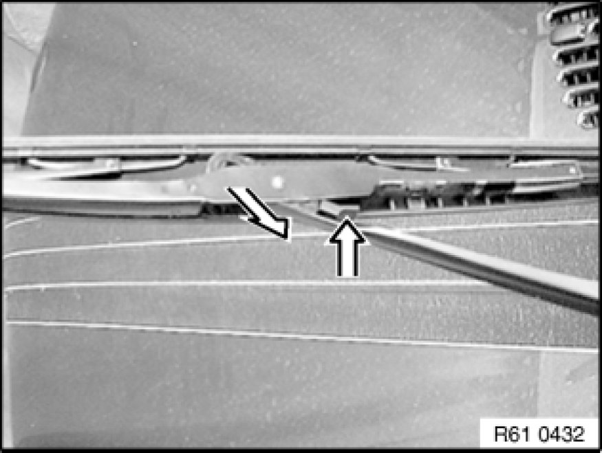 Press retaining spring in direction of arrow. Pull wiper blade in direction of wiper arm and remove.