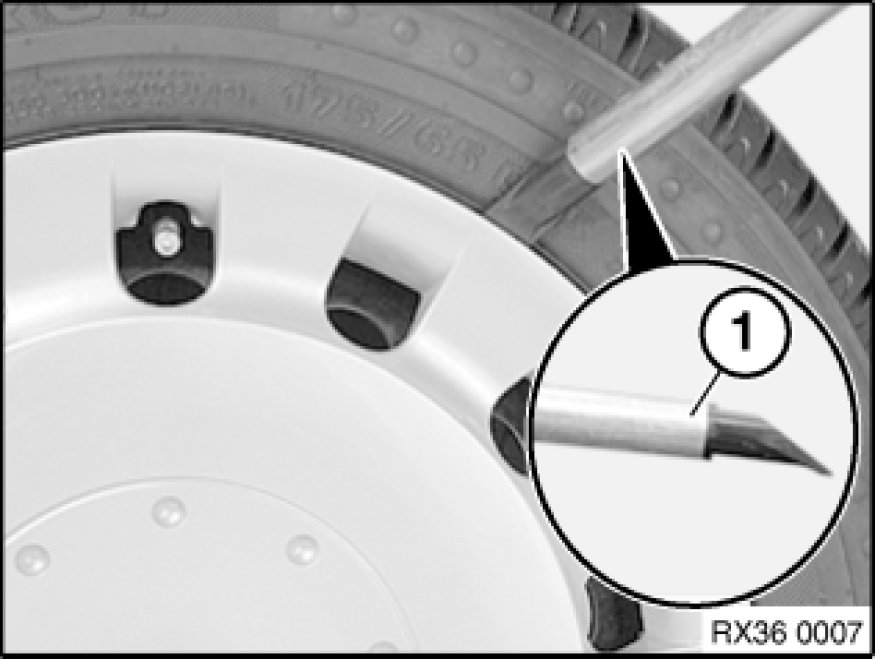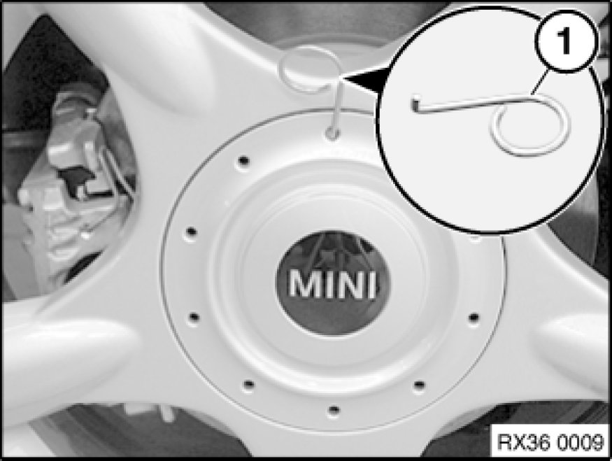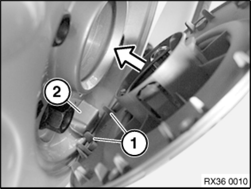 To fit the wheel trim, arrange the two retaining clips (1) over the wheel valve and press on the trim until it lies flush over the entire circumference of the wheel.