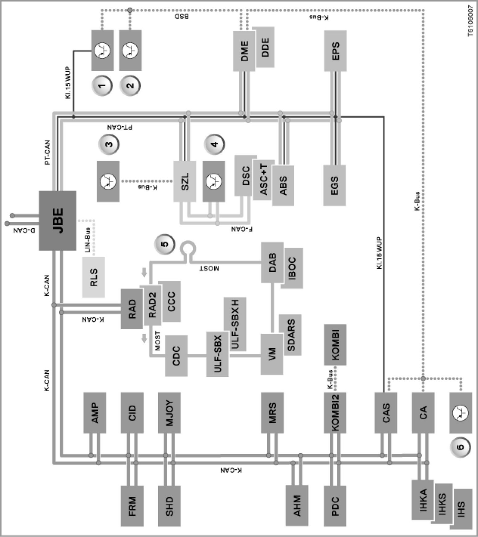 Here, the Car Access System (CAS) communicates with the digital engine electronics (DME). The CAS is responsible for terminal management and the comfort start. Moreover, the CAS is the master control unit for various system functions such as central locking and power windows.