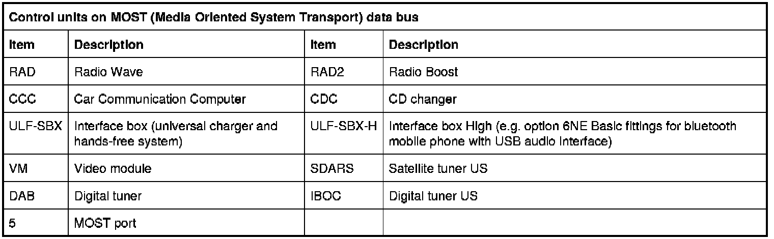 MOST means media oriented system transport MOST is a communication technology for multimedia applications developed for use in motor vehicles. The MOST bus is made of plastic fibre optics. Light pulses are used to transfer data. The MOST is constructed as a ring. Data transfer only runs in one direction. The physical direction of the light is from the master control unit to the connected control units. From the last control unit, the light goes back to the port of the master control unit. A 2nd MOST interface allows the network to be extended by further MOST control units.