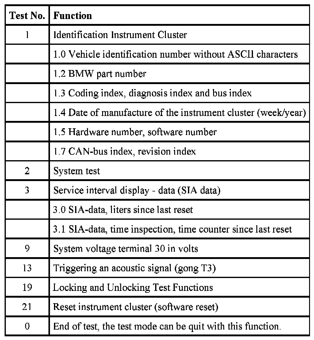2.1 To start the test functions, the ignition must be off. Then press and hold down the trip recorder reset button in the instrument cluster. Then switch the ignition on. "tESt 1" appears in the display. Pressing the reset button again takes you to the different test numbers.
