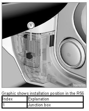 The junction box is located in the side of the passenger footwell. In order to reach the junction box, the cover must be removed from the passenger footwell trim panel. The junction box consists of the power distribution box and the junction box electronics.