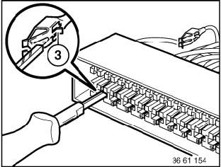 With special tool 61 1 136 or 61 1 137 (ejector), press back arrester hook (3) of appropriate contact and pull out cable.