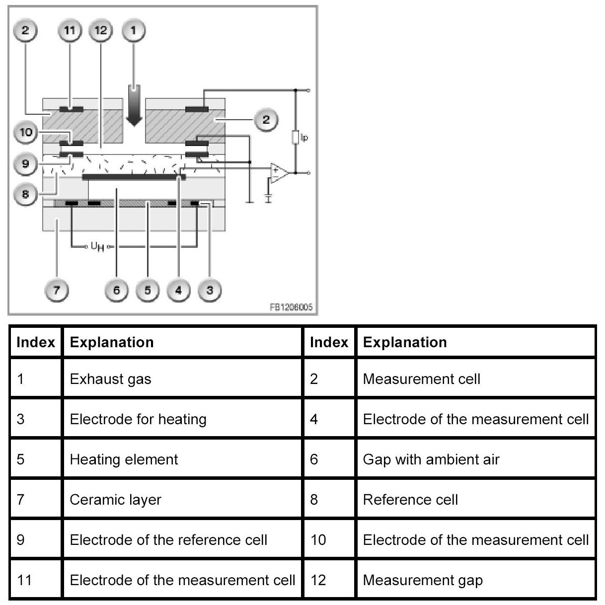 The sensor system of the broadband oxygen sensor consists of ceramic layers of zirconium dioxide (laminate). The heating element inserted in the laminate rapidly ensures the required operating temperature of at least 750 °C. The broadband oxygen sensor has 2 cells, a so-called measurement cell and a reference cell. The two cells are coated with electrode made of platinum.