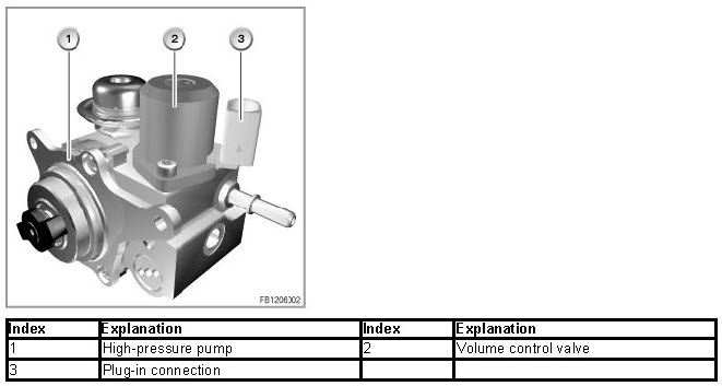 2 pistons in the high-pressure pump generate the necessary pressure in the fuel system. The inlet camshaft drives the high-pressure pump mechanically. The maximum fuel delivery pressure is 120 bar. There is a volume control valve on the high-pressure pump. The digital engine electronics control unit activates the volume control valve.