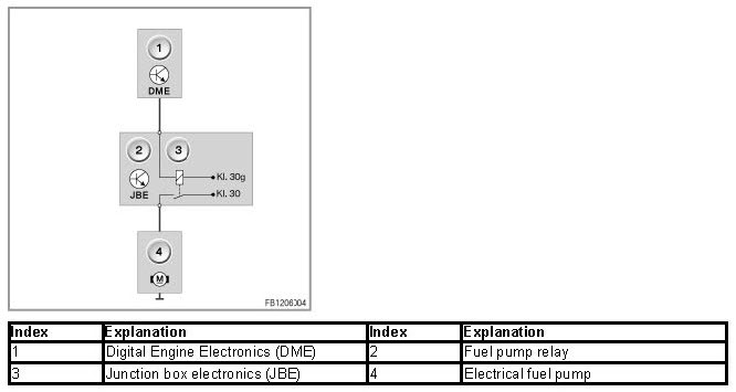 The electric fuel pump is an in-tank pump. The DME activates the fuel pump via the fuel-pump relay. The fuel-pump relay is in the junction box electronics.
