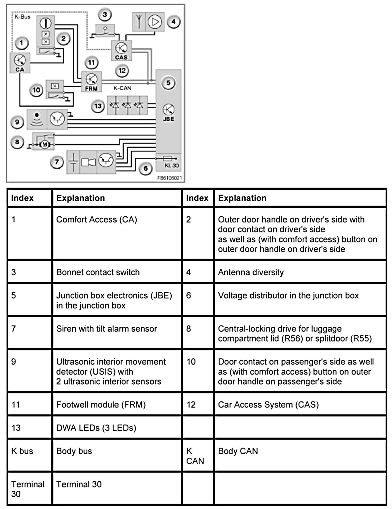 The door contacts on the driver's side and passenger's side are connected to the footwell module (FRM). This monitors the doors (open or closed).The FRM forwards the message on the K-CAN to the junction box electronics (JBE).
