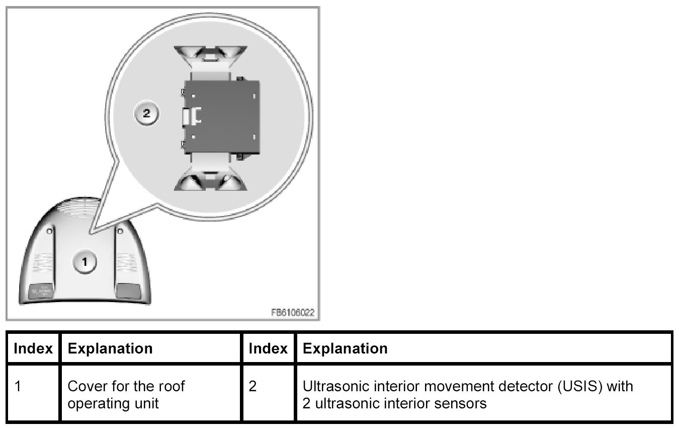 The ultrasonic interior movement detector (USIS) with the 2 ultrasonic interior sensors is fitted in the roof operating unit. The 2 ultrasonic interior sensors monitor the vehicle interior.