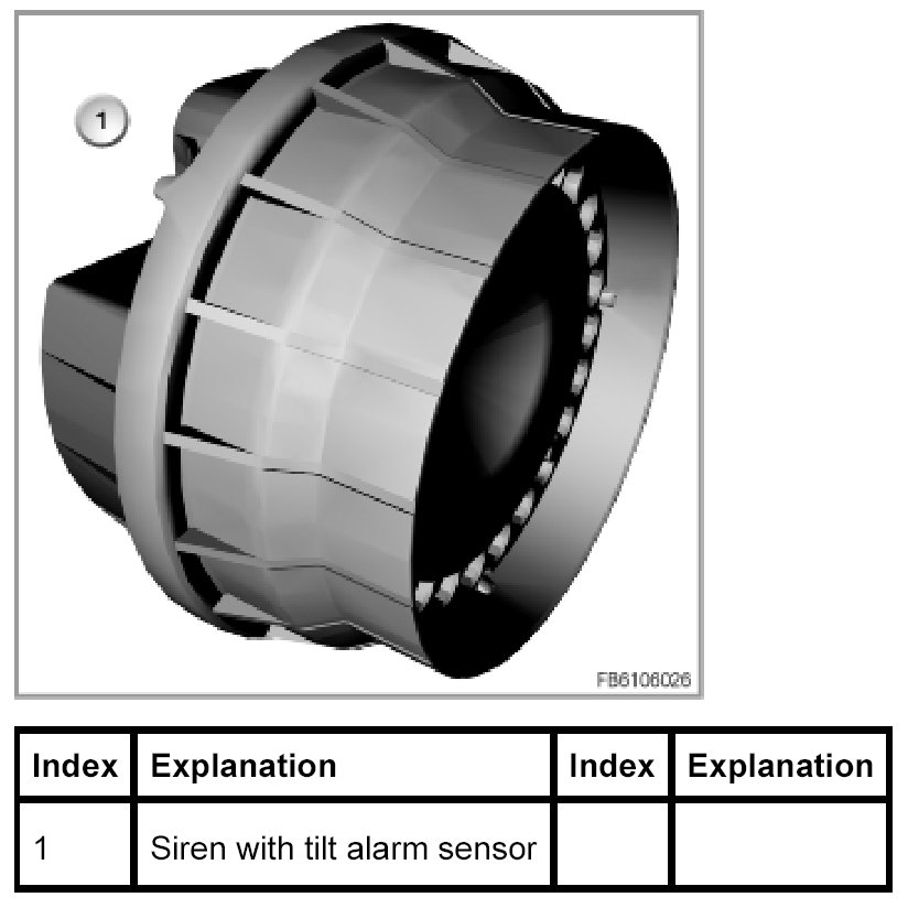 The tilt alarm sensor (integrated in the siren) monitors the vehicle inclination. The tilt alarm sensor detects whether the vehicle is lifted or towed.