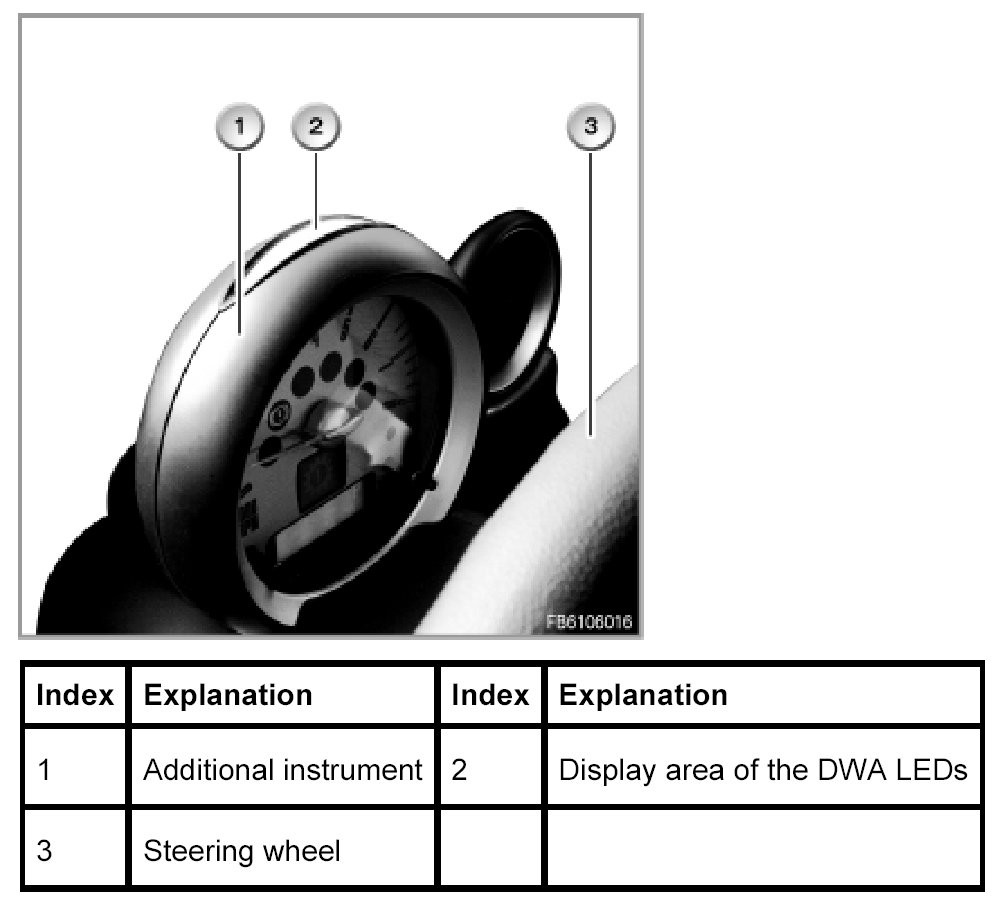 The 3 DWA LEDs indicate the states of the anti-theft alarm system (DWA) visually on the additional instrument. In addition, the 3 LEDs are to simulate the 'breathing' or 'heartbeat' of the MINI for a certain period on arming the DWA before the switch to the usual 'flashing'. All 3 LEDs only light up during simulation of the "heartbeat".
