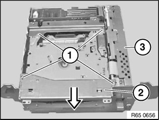 Feed CD drive (2) in direction of arrow out of Car Communication Computer (3) and set down.