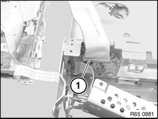 Raise cover (1) with special tool 64 1 020 all round and remove from Car Communication Computer (2).