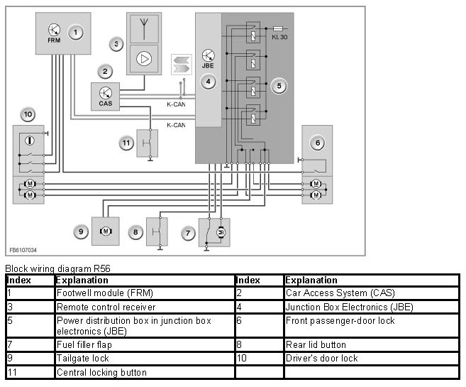 The footwell module (FRM) detects the signals from the door contacts. The FRM forwards the signals over the K-CAN to the junction box electronics (JBE). Remote control