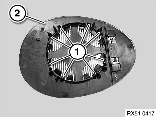 Fit mirror glass (2) with retaining lugs (1) flush on mirror adjusting drive and clip into place.