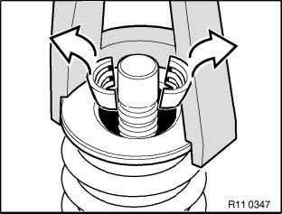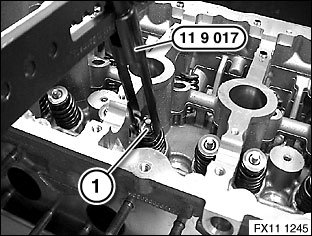 Press down valve spring and spring retainer (1) with special tool 11 9 017.