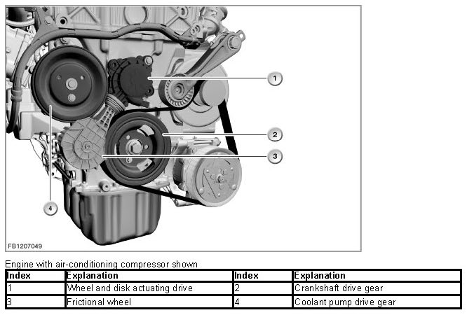 On the N12 engine, the coolant pump is driven for the first time by a friction disk. The back of the belt on the belt pulley of the crankshaft drives the friction disk. The friction disk drives the coolant pump. This has enabled elimination of a second belt drive.