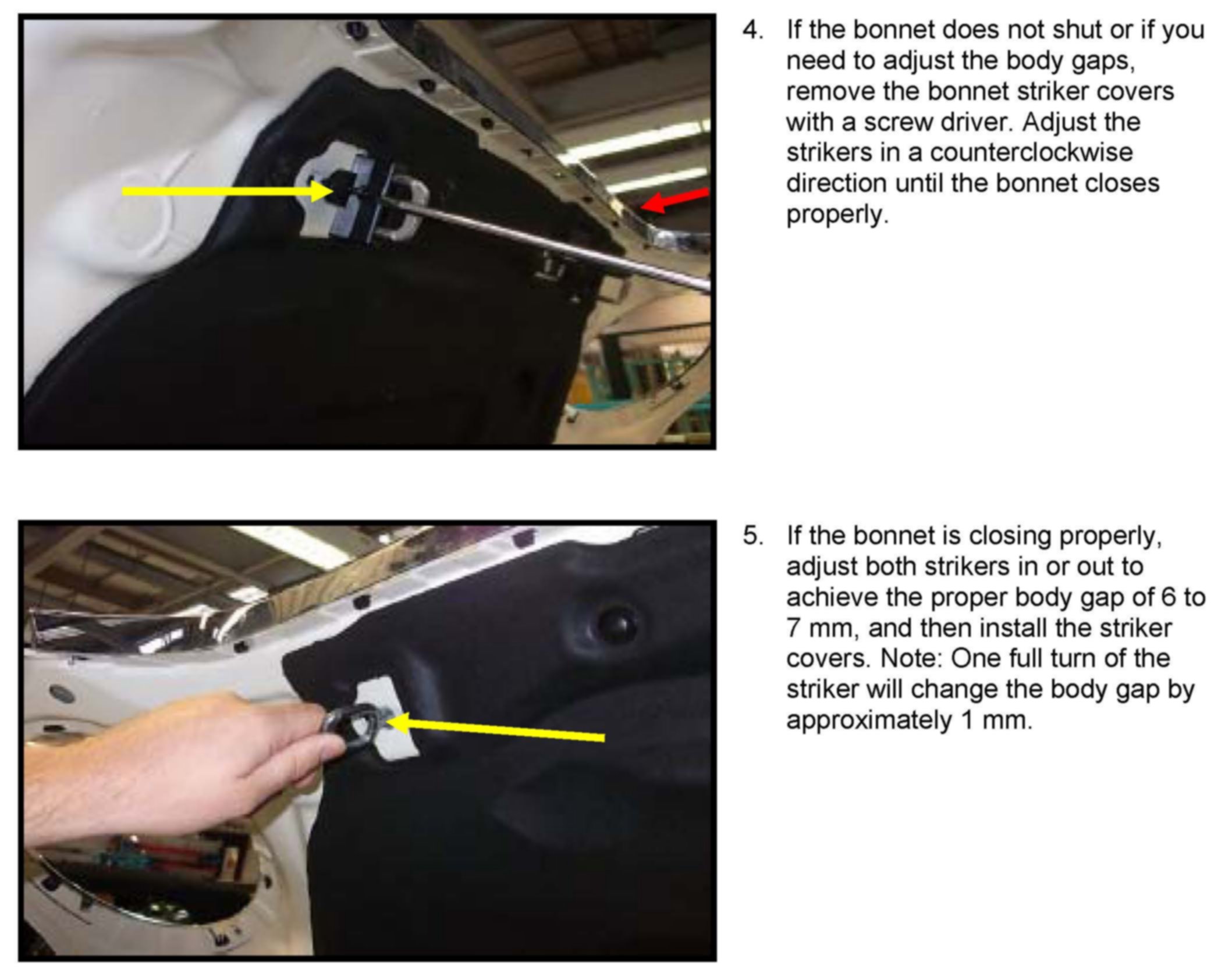 The bonnet is difficult to close and requires extra force to latch, resulting in misaligned body gaps.