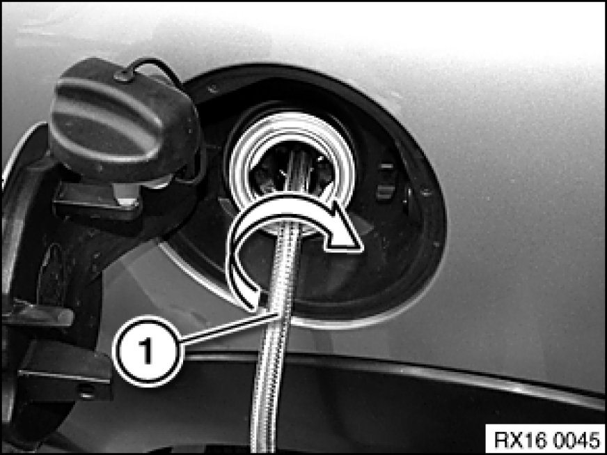 Feed suction hose (1) of extractor unit (refer to BMW Workshop Equipment & Planning Documentation) into filler pipe. In so doing, turn hose slightly if necessary.